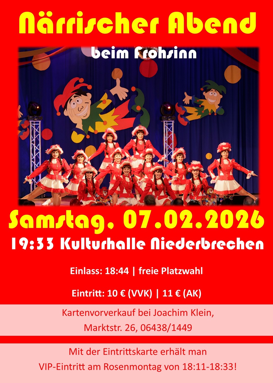Die Fastnacht 2026 steht in den Startlöchern: Der „Frohsinn“ Niederbrechen lädt zum Närrischen Abend am 7. Februar 2026 in die Kulturhalle Niederbrechen ein. Ab sofort sind die Eintrittskarten im Vorverkauf erhältlich. Freut euch auf ein abwechslungsreiches Bühnenprogramm und eine ausgelassene After-Show-Party – der perfekte Auftakt in drei närrische Tage.